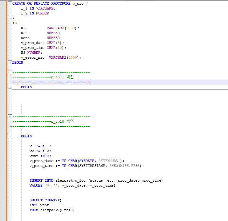 간단하게 NOTEPAD로 BEGIN END 묶인 부분을 보여주면 각각 테이블 별 BEGIN을 묶고 전체 프로시저의 BEGIN으로 나누었다.