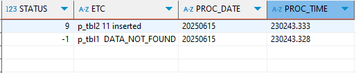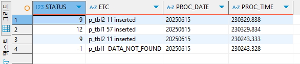 이를 통해 실행시켜보면 실행 1회차엔 P_LOG 테이블내 STATUS -1값이 존재하지 않기 때문에 실패하며