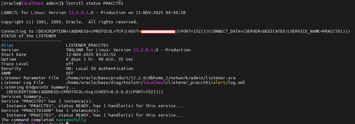 ADR_BASE_LISTENER_PRACCT01 = /home/oracle/base LISTENER_PRACCT01 = (DESCRIPTION_LIST = (DESCRIPTION = (ADDRESS = (PROTOCOL = TCP)(HOST = 0.0.0.0)(PORT = 1521)) ) ) SID_LIST_LISTENER = (SID_LIST = (SID_DESC = (SID_NAME = PRACCT01) (ORACLE_HOME = /home/oracle/base/product/11.2.0/dbhome_1) ) ) |
