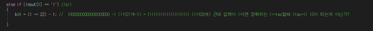 bit = (1 << 22) - 1; // 10000000000000000000 -1 (1이21개-1) = 11111111111111111111 (1이20개) 근데 입력이 1이면 정확히는 1<<tmp할때 (tmp=1) 10이 되는게 아닌가?