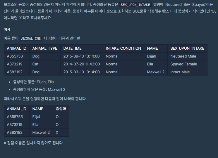 case when (SEX_UPON_INTAKE like '%Neutered%' or SEX_UPON_INTAKE like '%Spayed%')then 'O' else 'X' end as '중성화'
